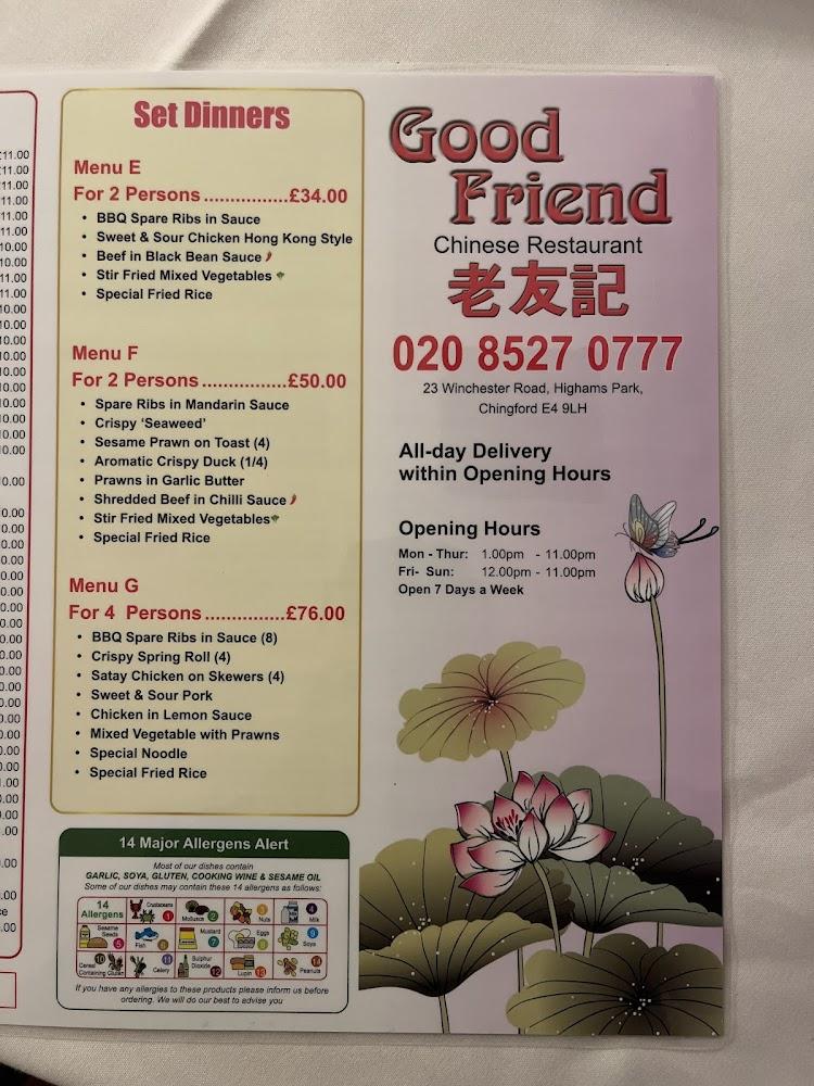 Located at 23 Winchester Rd in London E4 9LH, Good Friend Chinese Restaurant stands out as a community hub for lovers of Chinese cuisine. This accessible venue boasts wheelchair-friendly entrances and seating, ensuring everyone feels welcome. Its location is convenient, with free street parking available, attracting both locals and visitors alike seeking a satisfying meal. The restaurant’s vibrant atmosphere complements its excellent food, making it a favored choice for both solo diners and groups celebrating special occasions. The interior fosters a casual and cozy vibe, perfect for unwinding after a busy day or catching up with friends. With a commitment to quality service, the staff here pays attention to every detail to create a memorable dining experience. Open seven days a week, this restaurant thrives as a local favorite, especially during peak times, but also welcomes guests who prefer the quieter midday hours.
